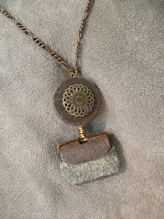 Mixed medal fare. Delicate industrial chic, this 20-inch necklace mixes found metal pieces and chain, some recycled, some not, and some USA-made natural brass chain. The earrings swing with the same mix.